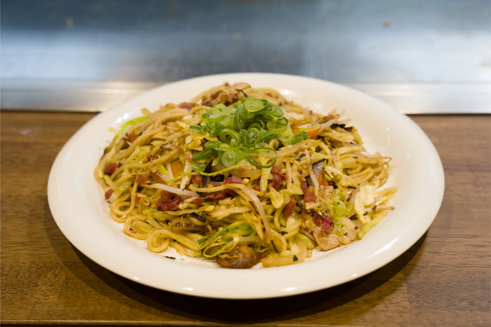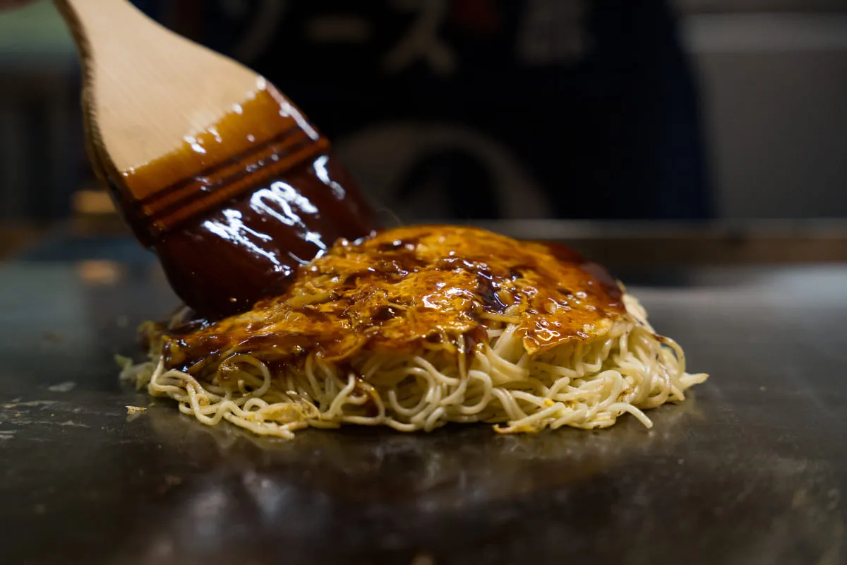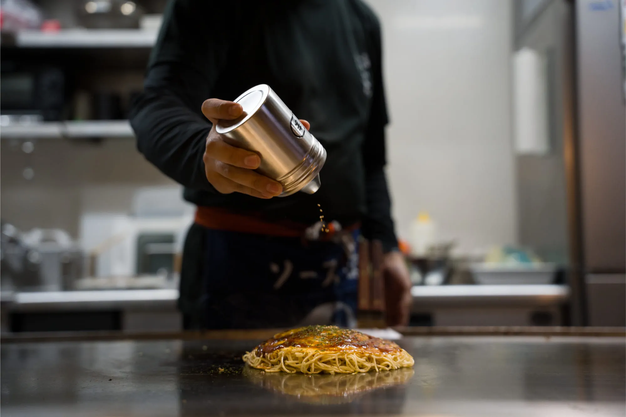 - キャベツの甘みを引き出す蒸し焼きの工程や、魚粉の旨味、出汁で焼き上げる麺など、