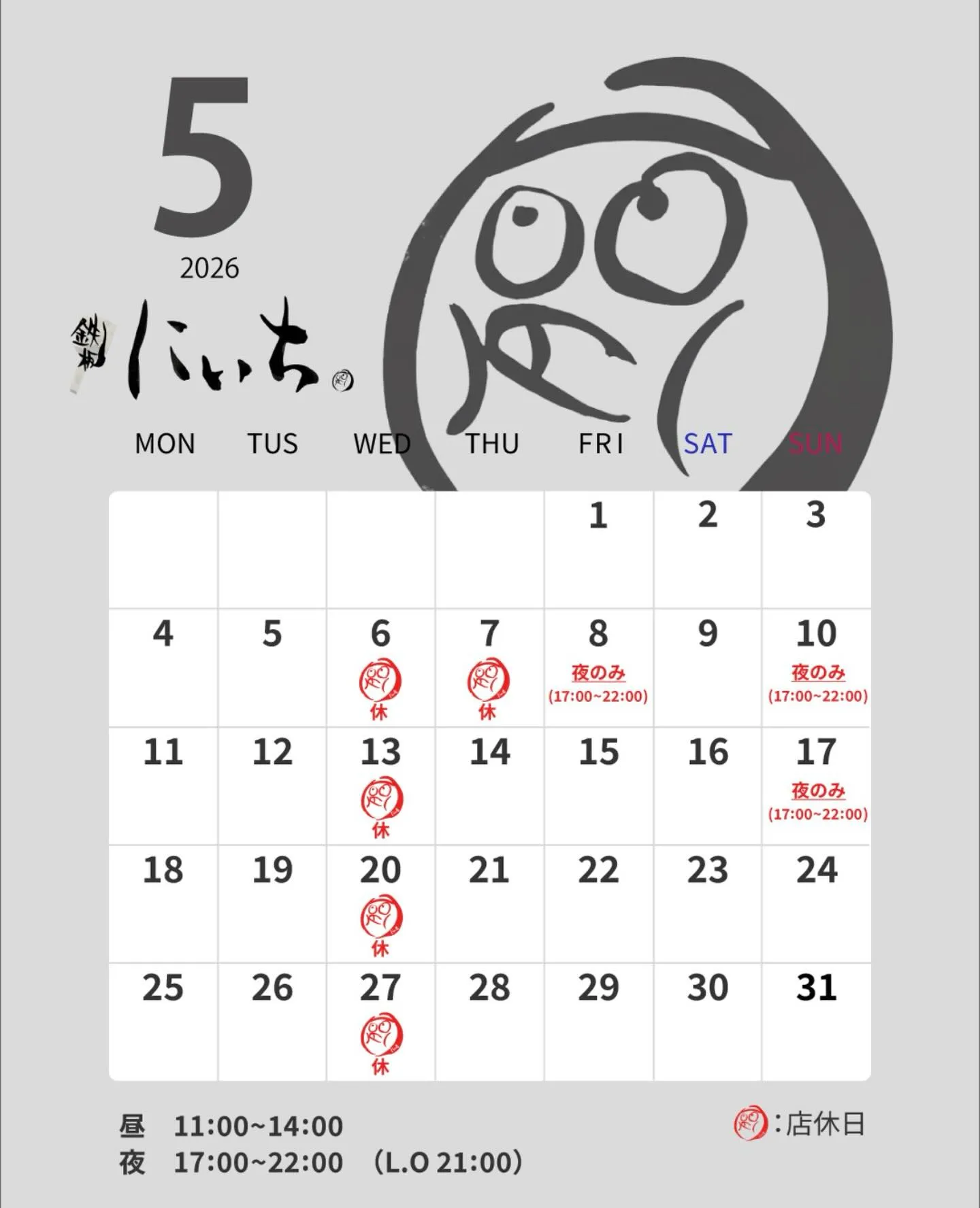📢🌸 5月の営業スケジュールのご案内です!みなさんお楽しみのゴールデンウィークですが、当店は通常通り営業いたしますので、普段忙しくて来られない方や、帰省中のご家族やご友人と一緒にぜひご来店ください😊